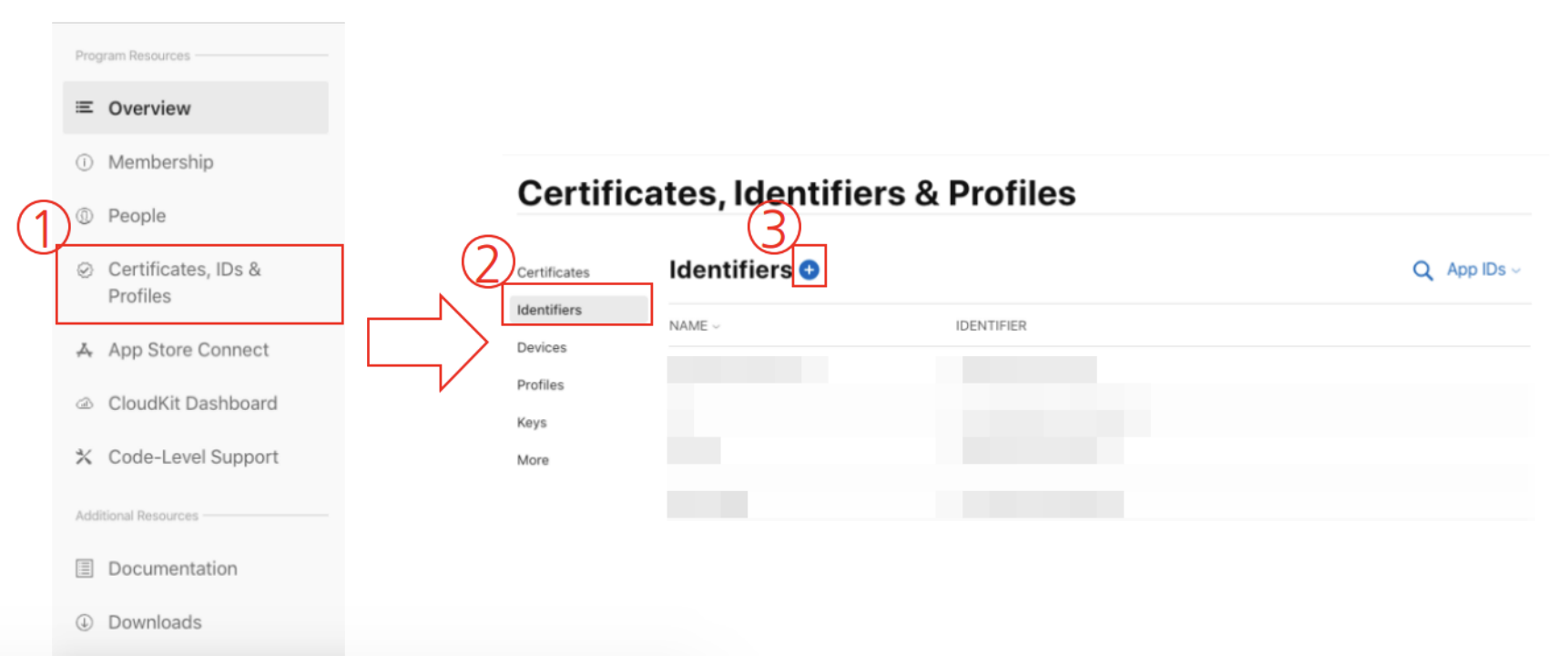 2. 좌측 메뉴 Certificates, IDs & Profiles 클릭 -> Identifiers 클릭하여 앱에 대한 새로운 식별자를 추가 진행한다.