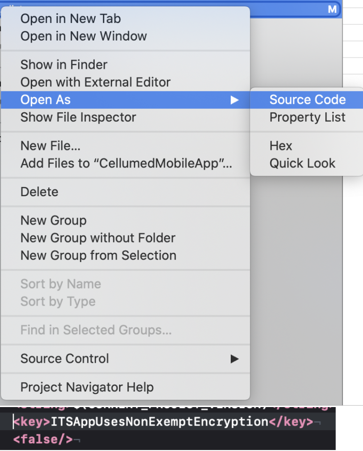 8. Xcode 프로젝트 info.plist -> Open As -> Source Code 선택후