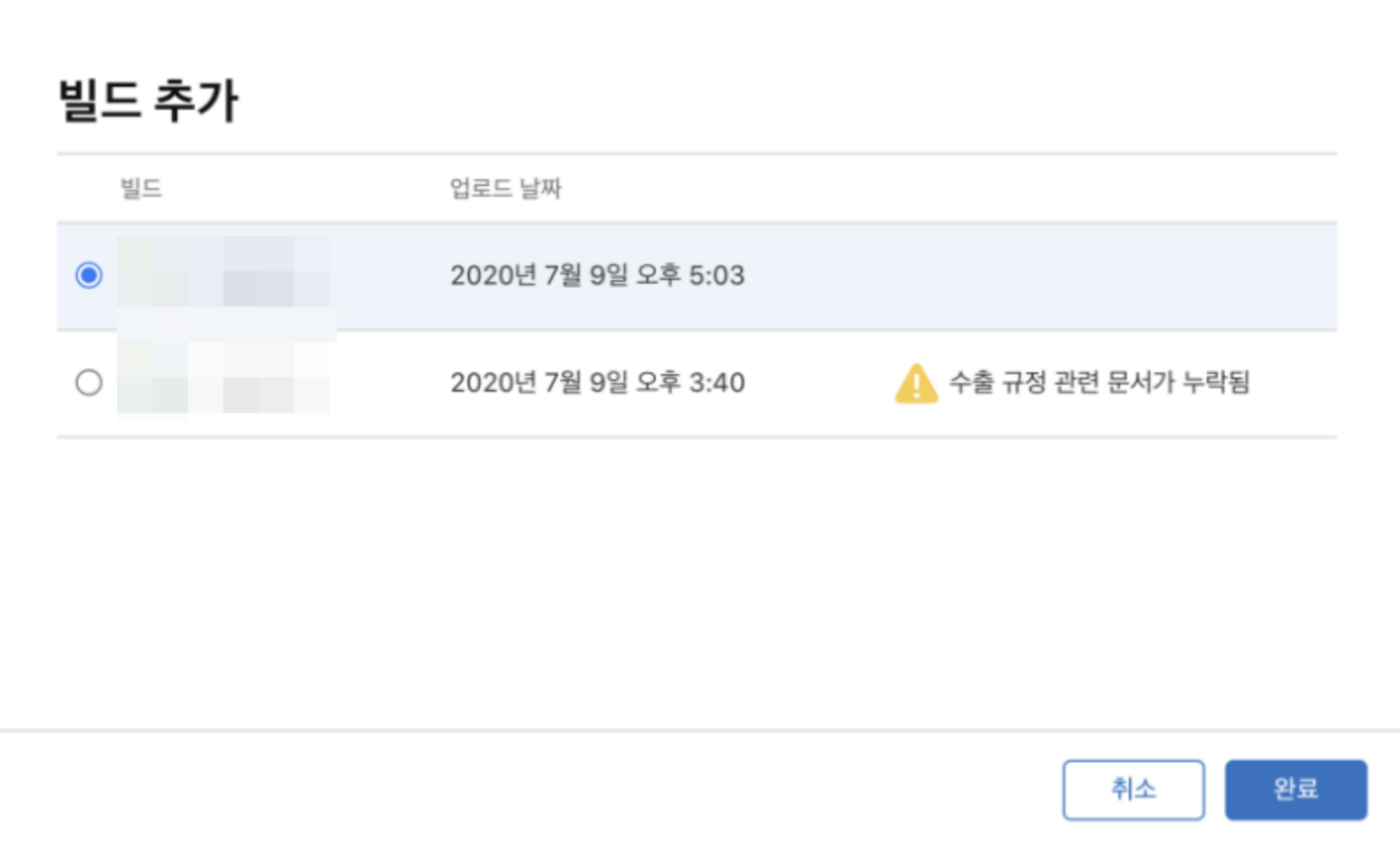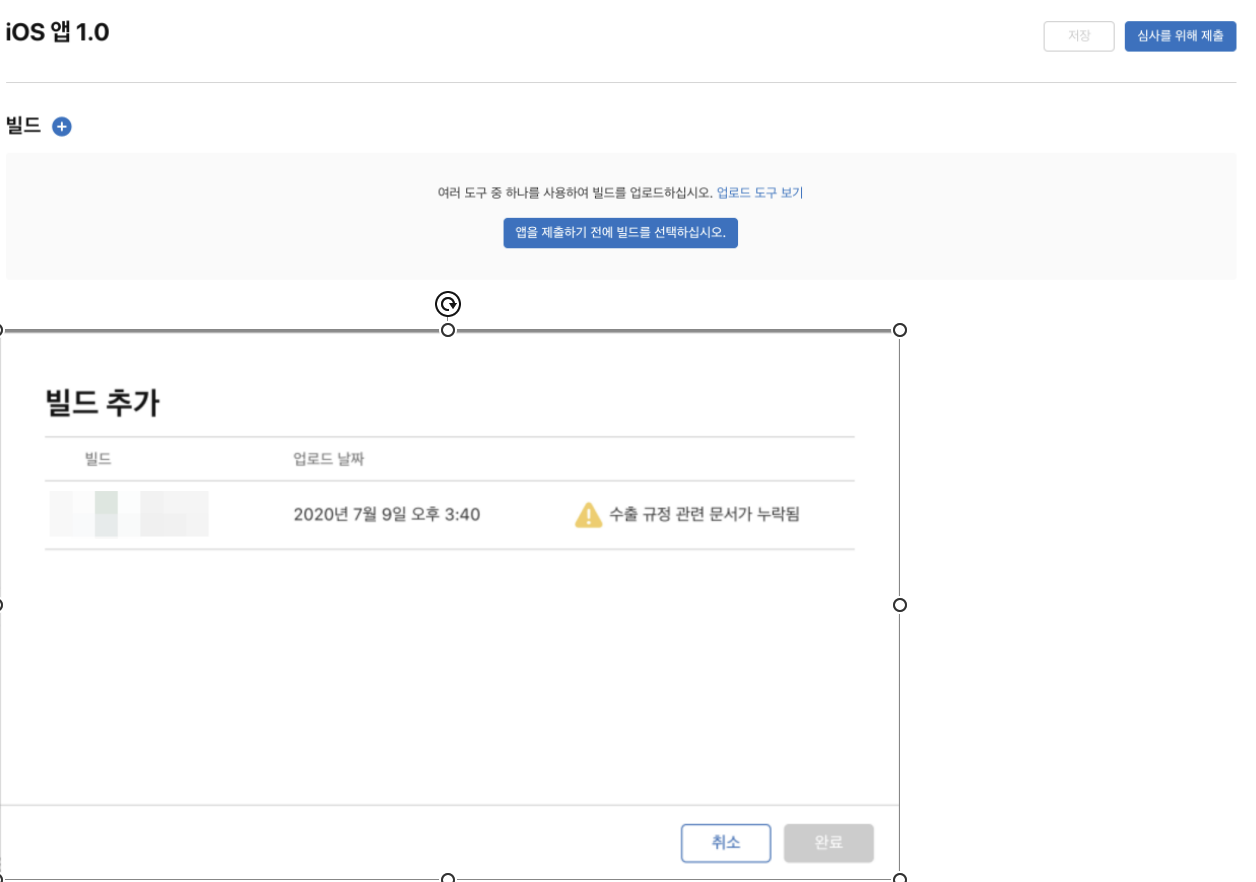 빌드 선택하면 다음과 같이 수출 규정 문서가 누락됨 이라는 문구를 볼수있다...