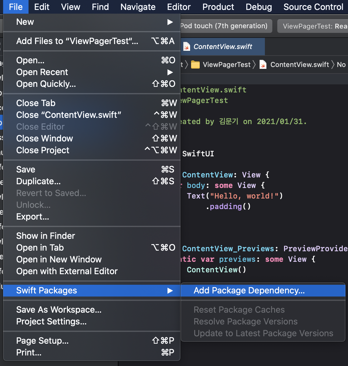 1-1 : 프로젝트 File -> Swift Packages -> Add Package Dependency 클릭
