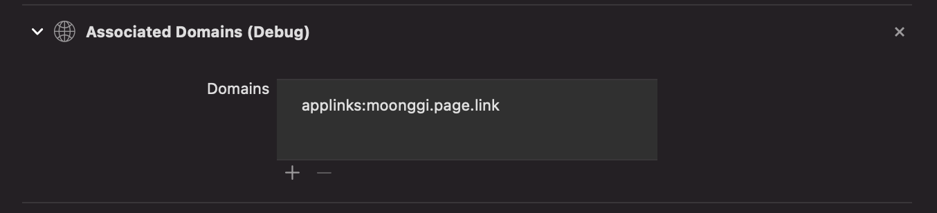 - 프로젝트 셋팅 상에 Associated Domains 를 추가하여 프리픽스를 추가 합니다