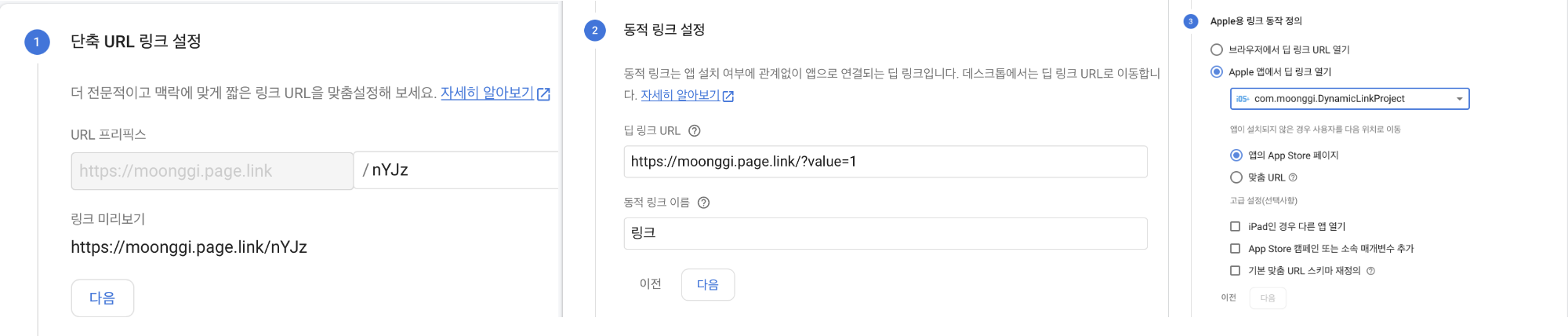 생성 예시 : https://moonggi.page.link/?link=https://moonggi.page.link?value=1&ibi=com.moonggi.DynamicLinkProject&isi=(ID값)