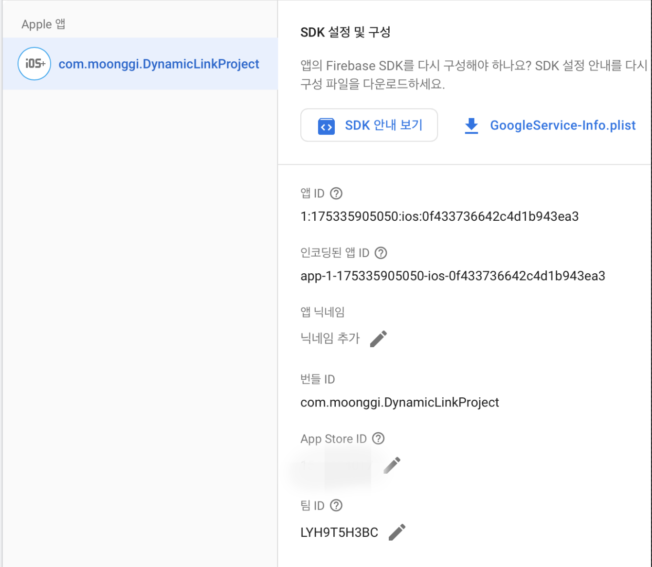 콘솔 프로젝트 설정 -> 일반 탭에서 App Store ID 값과, 팀 ID 값을 입력합니다.