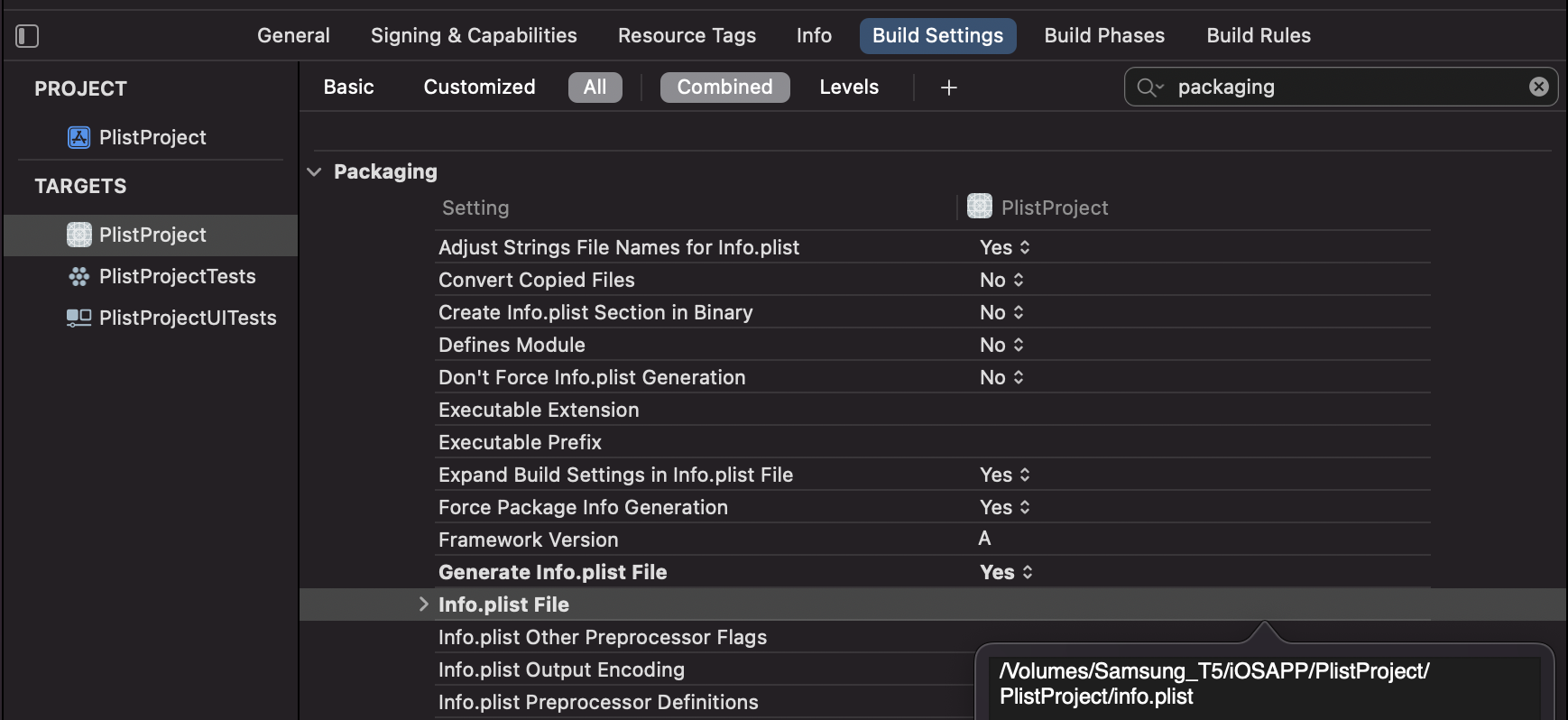2-2. Project -> Build Settings -> Packaging -> info.plist File 에 방금 복사 했던 내용을 붙여넣기 합니다.