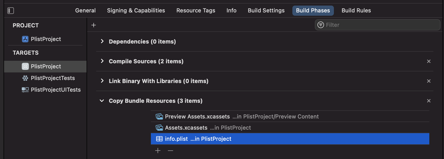 2-4. Project -> Build Phases -> Info.plist 하단에 - 클릭하여 제거 해줍니다.