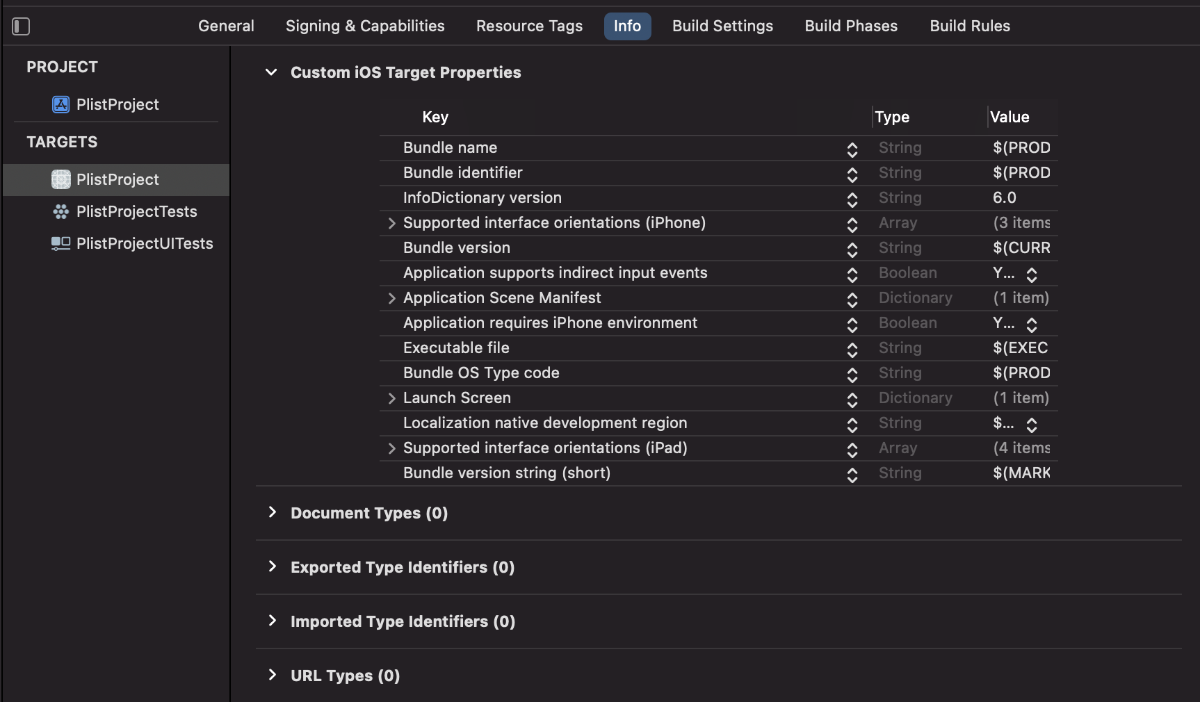 * 프로젝트 내부는 Project -> Targets -> Info -> Custom iOS Target Properties 에 있음!