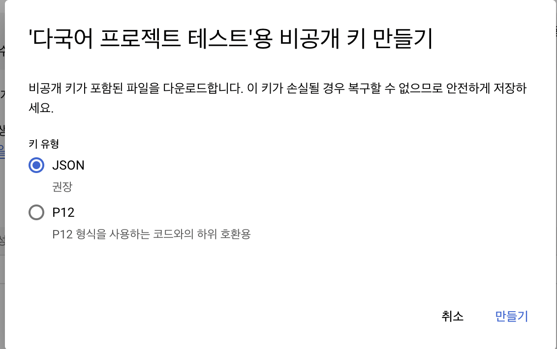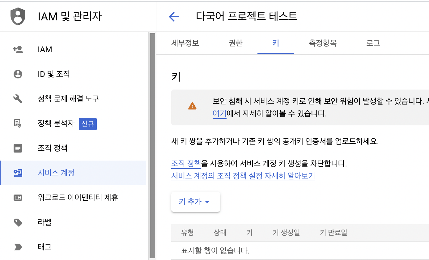 2-10. 키탭에 들어와서 키 추가를 해줍니다. 해당 키는 JSON 형태로 생성 해줍니다.