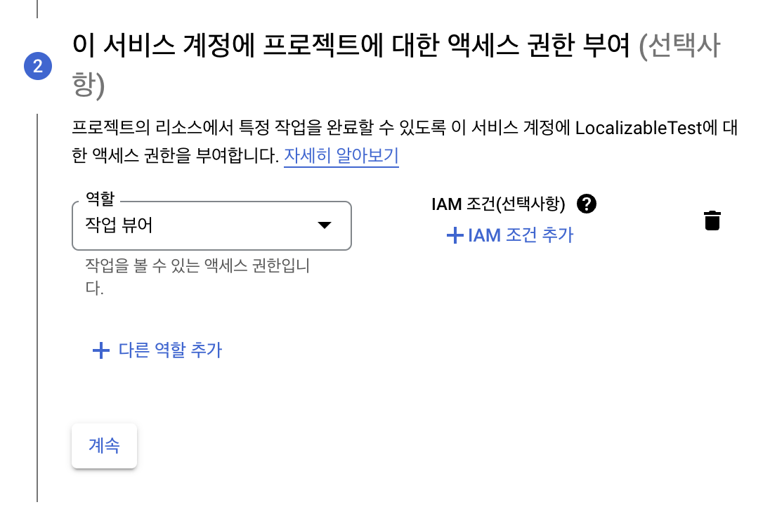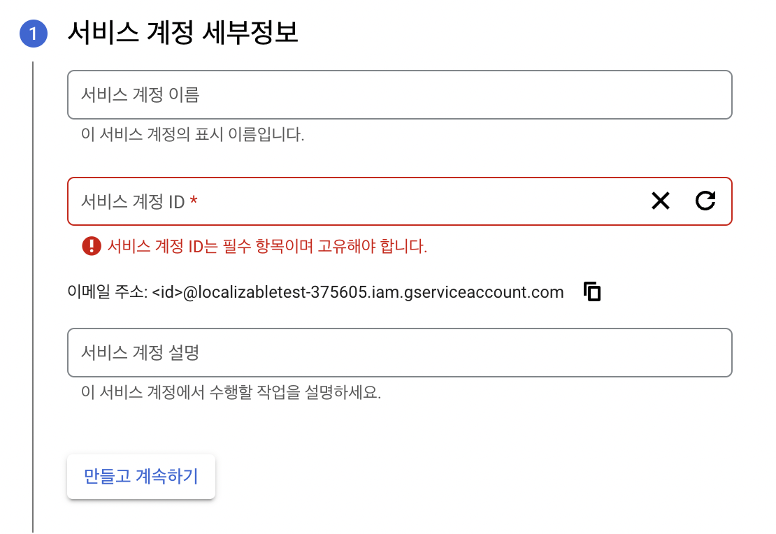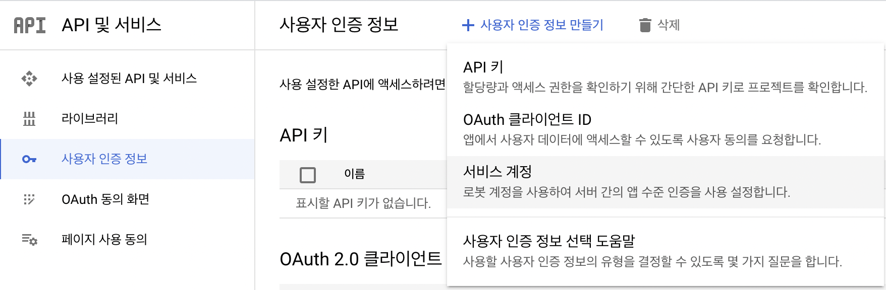2-8. 다시 대시보드로 돌아와 사용자 인증정보 만들기 -> 서비스 계정을 선택하여 아래와 같이 생성 해줍니다.