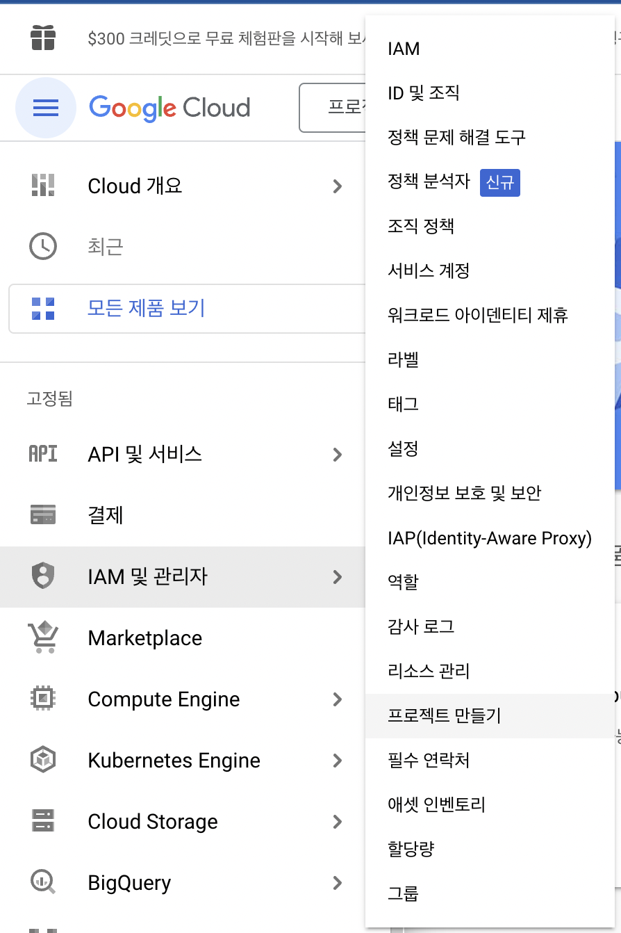 2-3. 좌측 메뉴에서 IAM 관리자 클릭후 프로젝트를 생성 합니다.