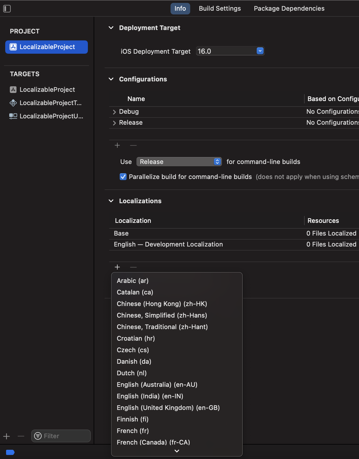 3-1. Project -> Info -> Localizations -> + 버튼 클릭후 사용 하고자 하는 국가 선택