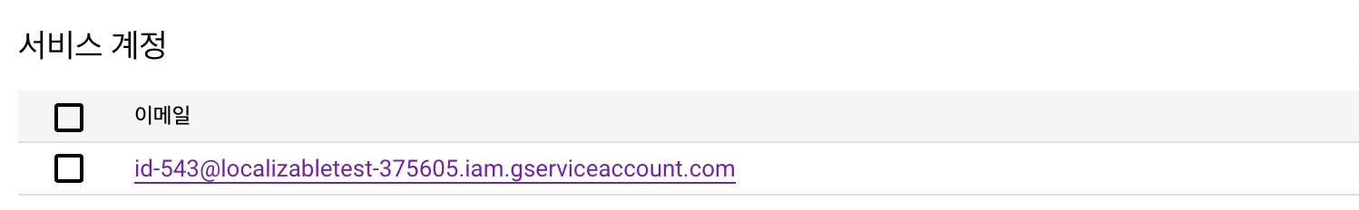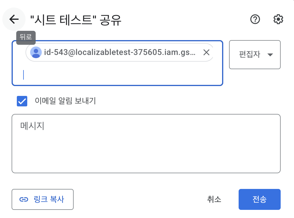 2-11. 서비스 계정에 있는 프로젝트 이메일을 복사해서 사용 하고자 하는 구글시트에 공유 해준다.