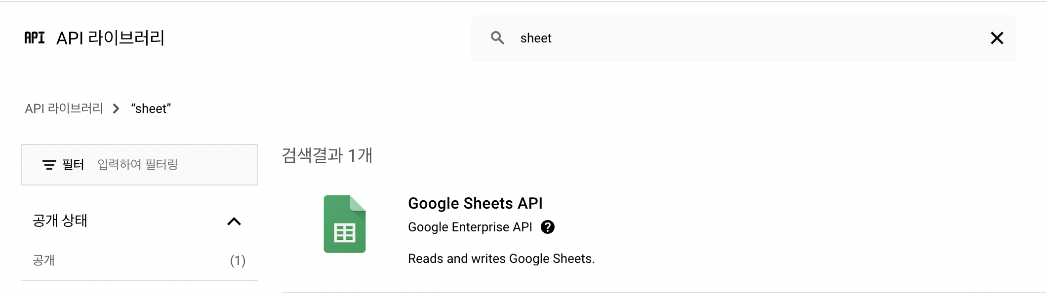 2-7. API 라이브러리 상에 Google Sheet 를 검색하고 API 허용을 해줍니다.