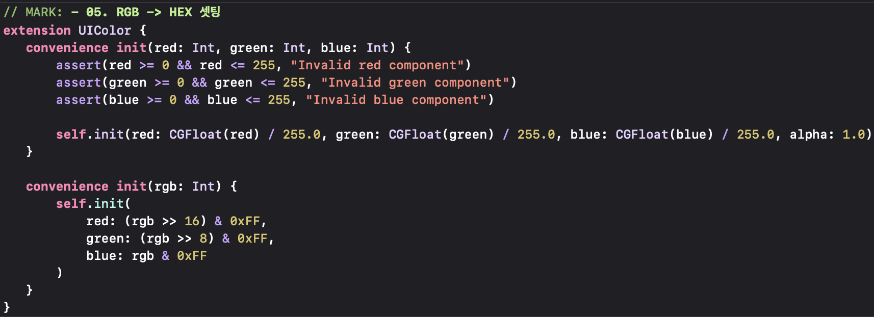 RGB 값을 HEX 값을 사용하기 위해 UIColor를 확장하며 해당 셋팅은 BaseController 에서 사용 하였다 (일반 Controller 에서 사용가능)
